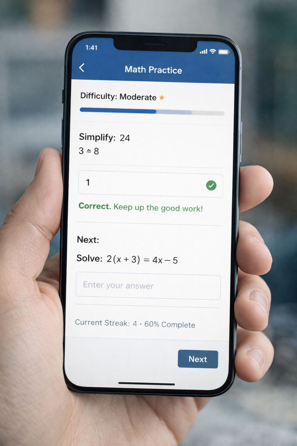 Interactive mathematics learning app featuring AI-generated questions and adaptive difficulty to strengthen problem-solving skills.