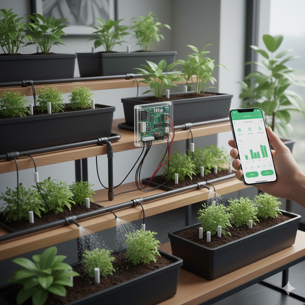 Smart irrigation system with sensor-based monitoring and phone-controlled automation.