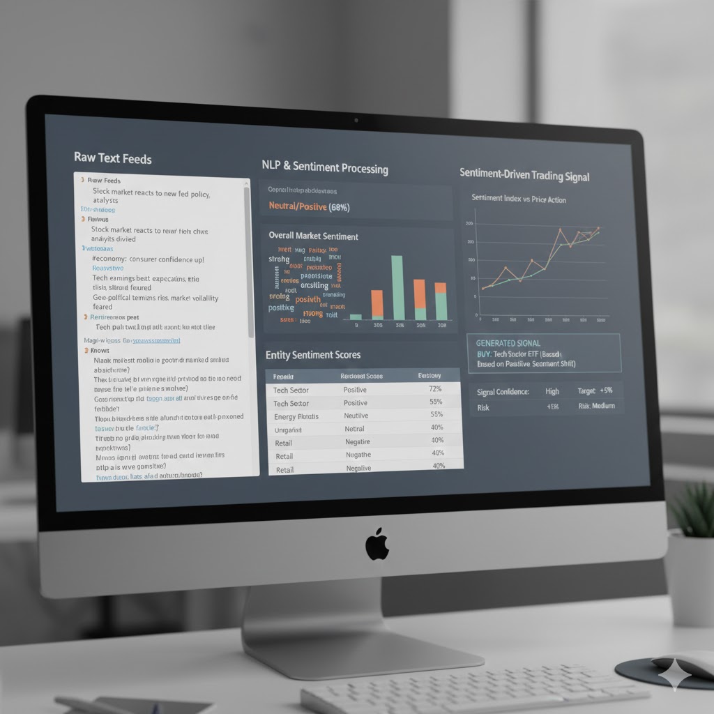 System for analyzing market sentiment from news and social media as an input to research and strategy development.