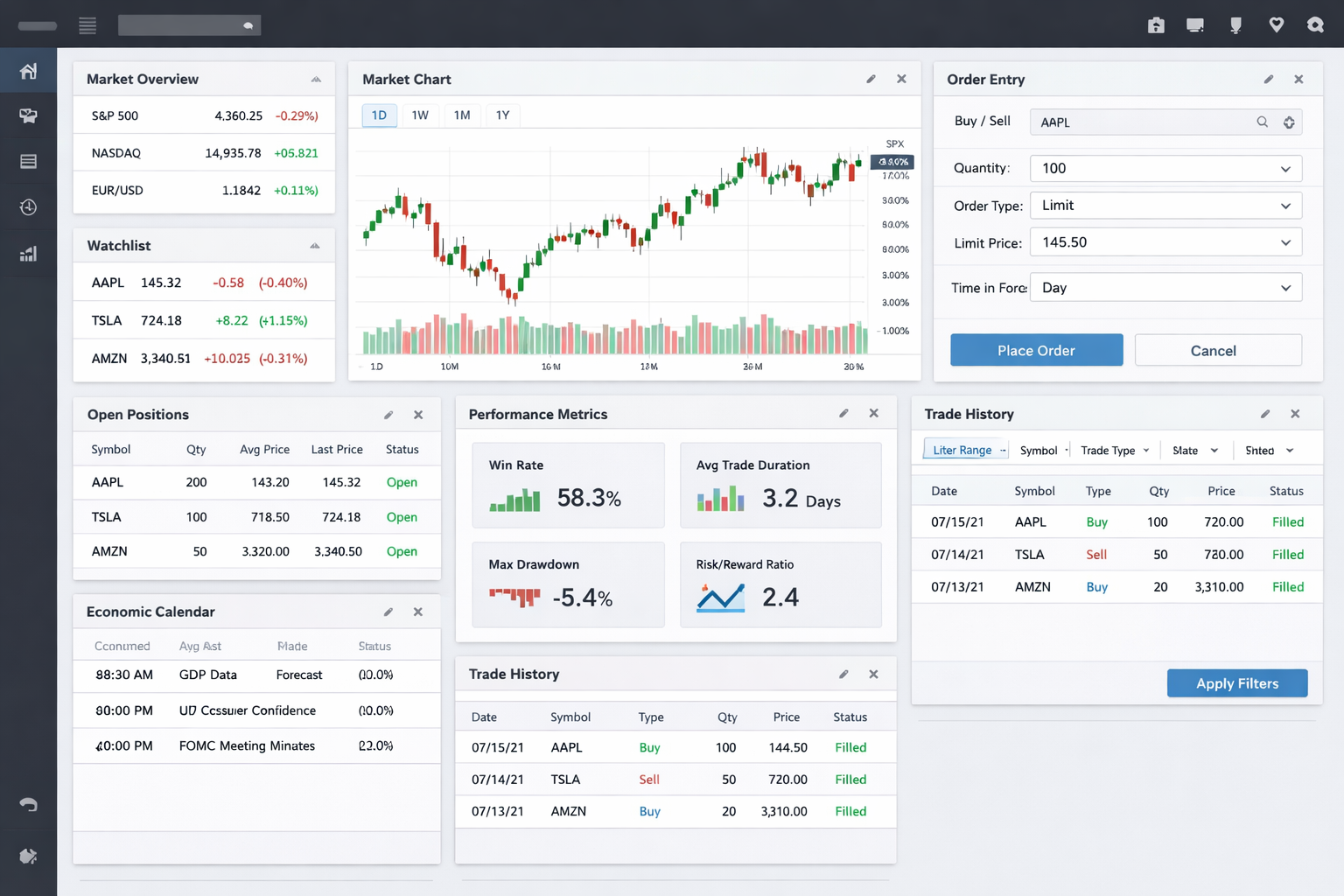 Data-driven web application showcasing trading workflows, analytics dashboards, and interactive visualizations.